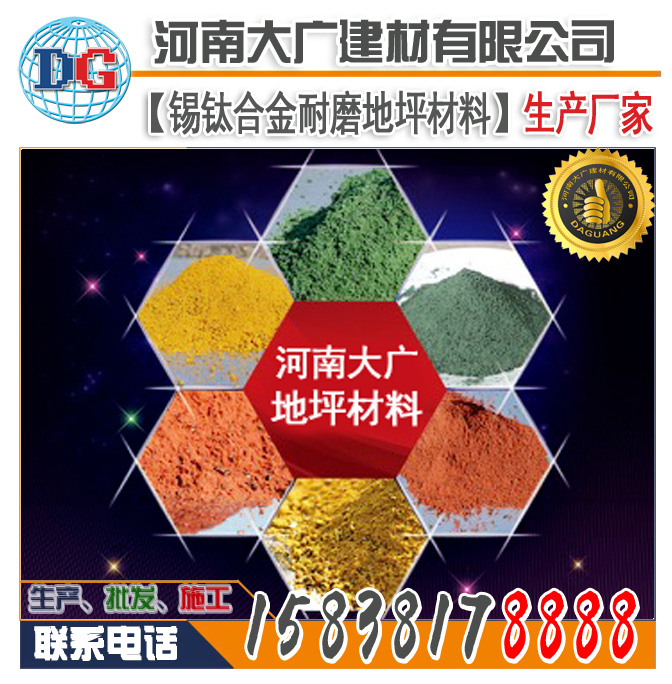 大廣牌錫鈦合金合耐磨地坪材料由一定顆粒級(jí)配的錫鈦合金骨料、高標(biāo)號(hào)水泥、顏料、微硅粉等其它摻合料和外加劑組成。將其均勻地撒布在初凝階段的混凝土表面,經(jīng)專工門工藝加工,從而使其與混凝土地面形成一個(gè)整體。且具有高致密度性和著色的高性能耐磨地面。
