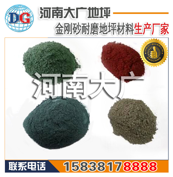 金剛砂骨料和石英砂骨料!本公司采用金剛砂骨料,金剛砂骨料比石英砂骨料硬度更高,效果更美觀!本廠作為河南省金剛砂源頭企業(yè),目前全省大部分廠家的金剛砂骨料由本公司提供,其調(diào)配好的金剛砂地坪材料顏色又分水泥本色、綠色、紅色、藍色、黃色常用顏色金剛砂耐磨材料,其它顏色也可訂制生產(chǎn)。